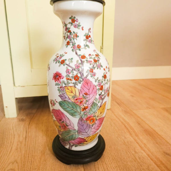 Laat je interieur bloeien met deze unieke vintage lampvoet die we vonden op een markt. Het verfijnde bloemmotief in warme tinten roze, geel en groen brengt een vleugje nostalgie en elegantie in je ruimte.